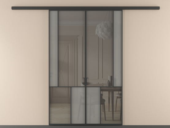 Во всех алюминиевых перегородках, независимо от типа установки, используется компланарный раздвижной механизм, благодаря которому декоративная крышка и полотно находятся в одной плоскости.